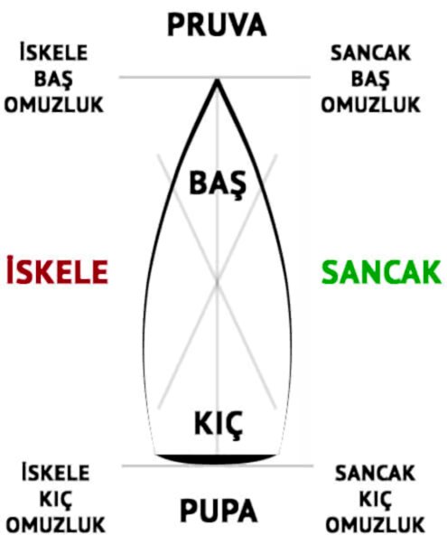 - Pupa:Teknenin kıç tarafından geriye olan istikamete denir. Örneğin seyir halinde arkadan bize yaklaşan tekne varsa. Pupa dan yaklaşan tekne denmesi gerekir.
